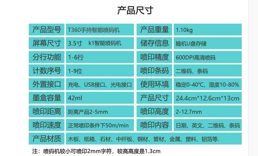 產品特點: 1.簡約風格,手持更方便。 2.智能噴碼,噴碼效果清晰。 3.噴碼機新升級,可直接編輯,多種點狀字。 4.大小面積均可噴碼。 5.4.3寸真彩全觸屏操作界面,所見即所得。